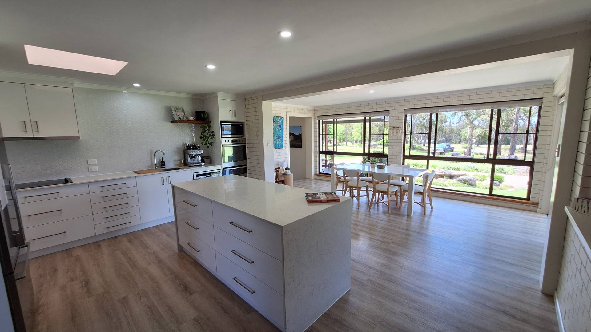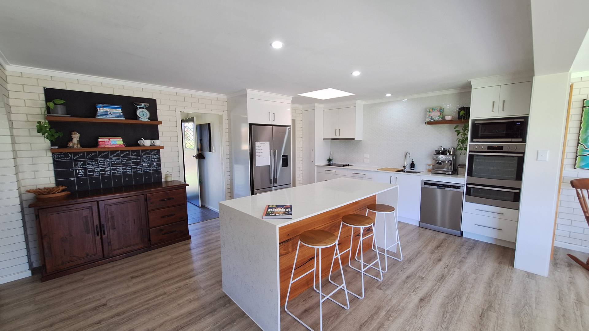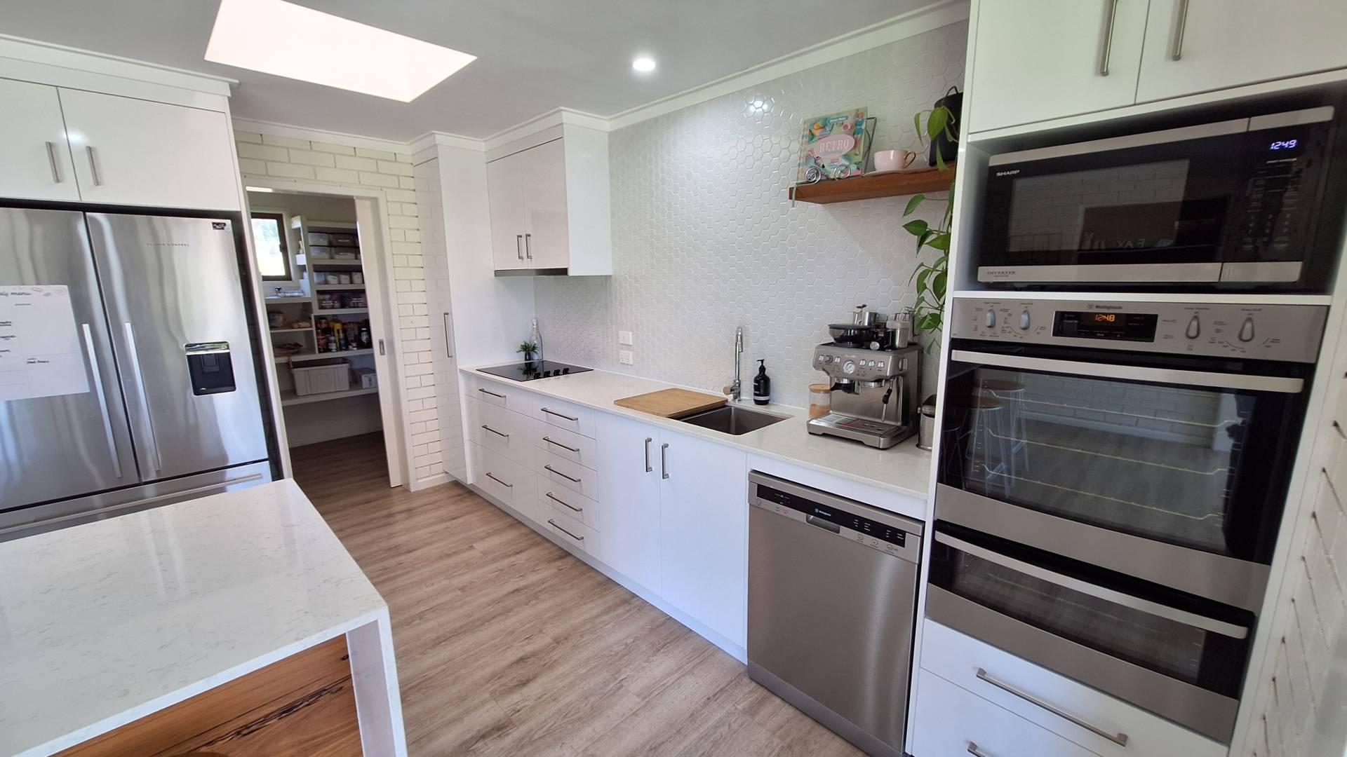Kitchen has been fully refurbished with generous bench and storage space, hotplate, rangehood, stainless wall oven/grill, island bench and a butlers pantry.